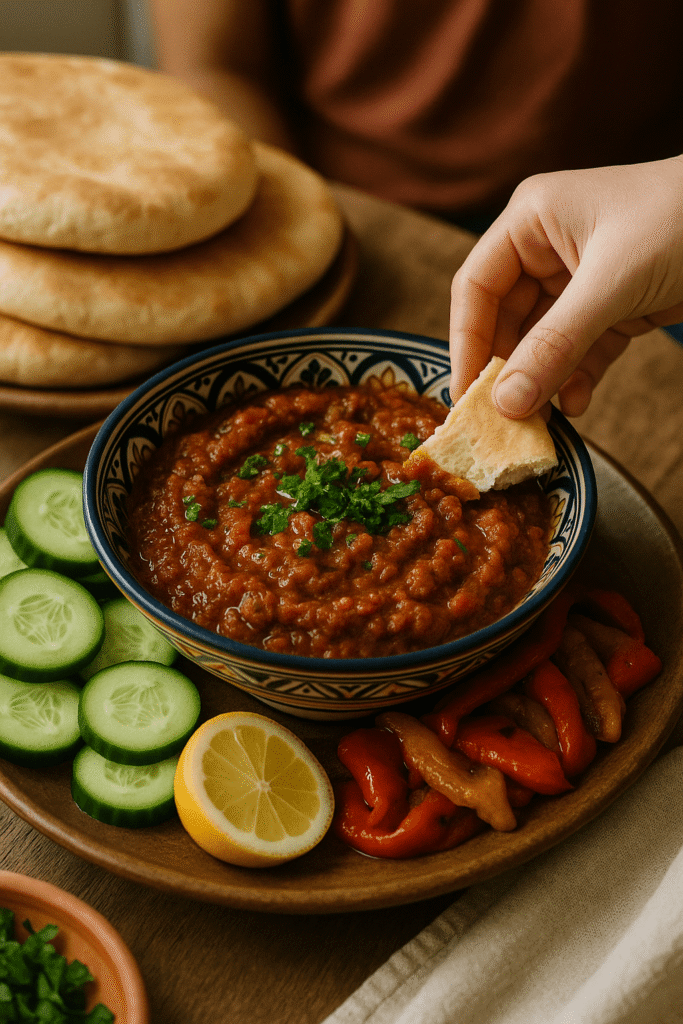 Unlike baba ganoush (which is smoother and tahini-based), zaalouk has a chunkier texture and a deeper, spiced tomato flavor.